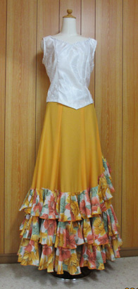 白ブラウスは大バラ柄地模様入り。